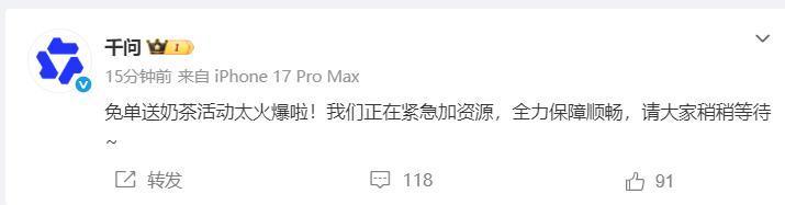 对此,千问在交代平台发文回复称:“免单送奶茶算作太火爆,正在迫切加资源,全力保险顺畅。”